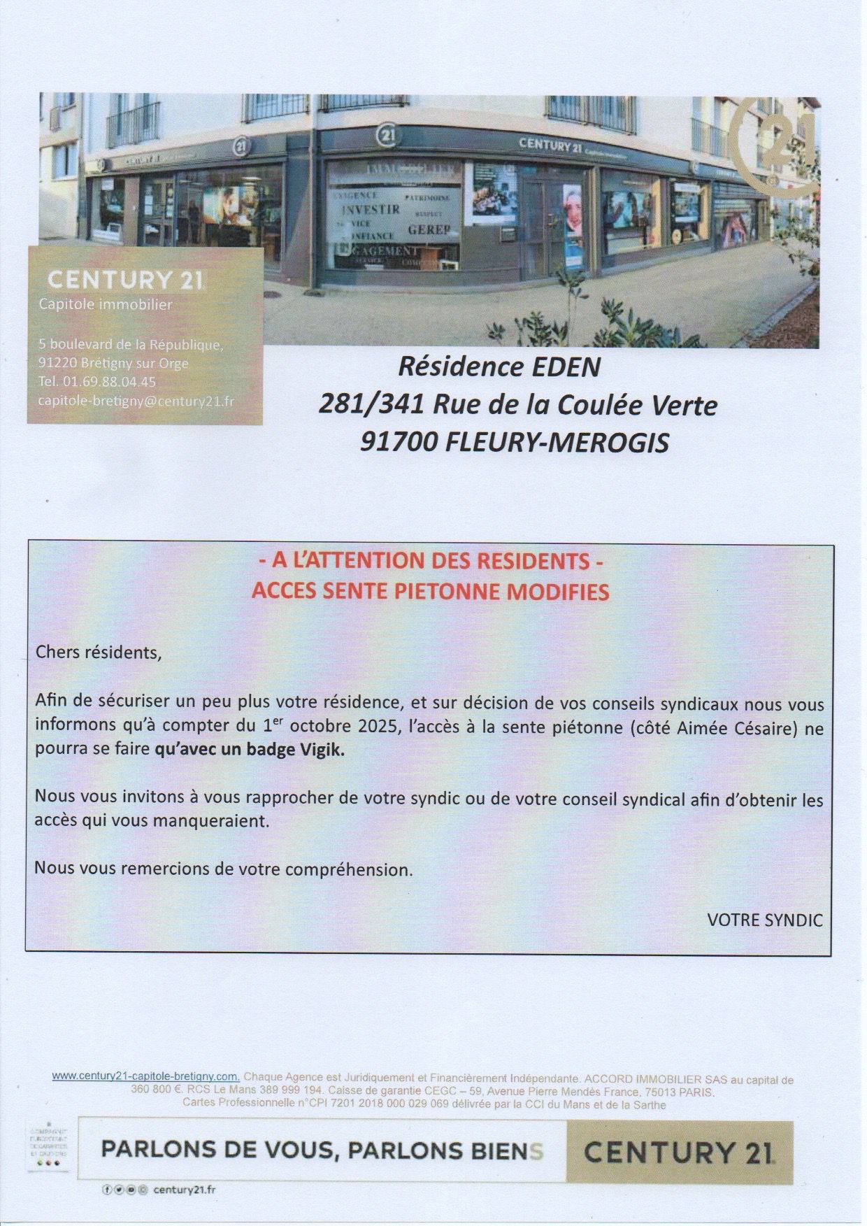 À compter du 1er octobre prochain, le portillon de la sente piétonne côté rue Aimé Césaire ne sera accessible en entrée qu’avec un badge Vigik.